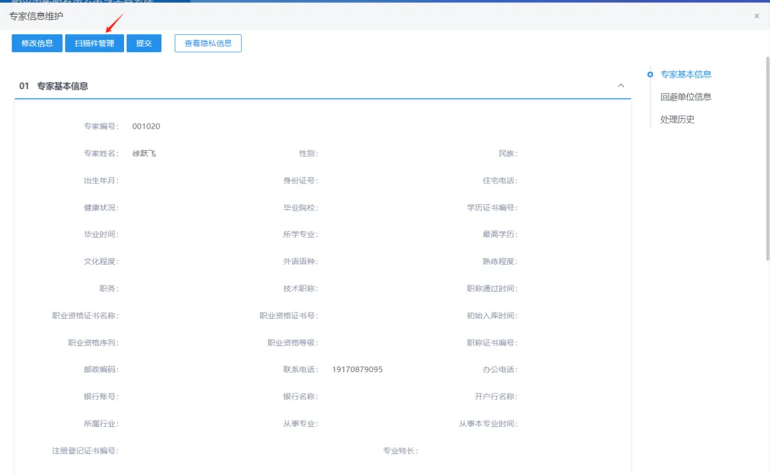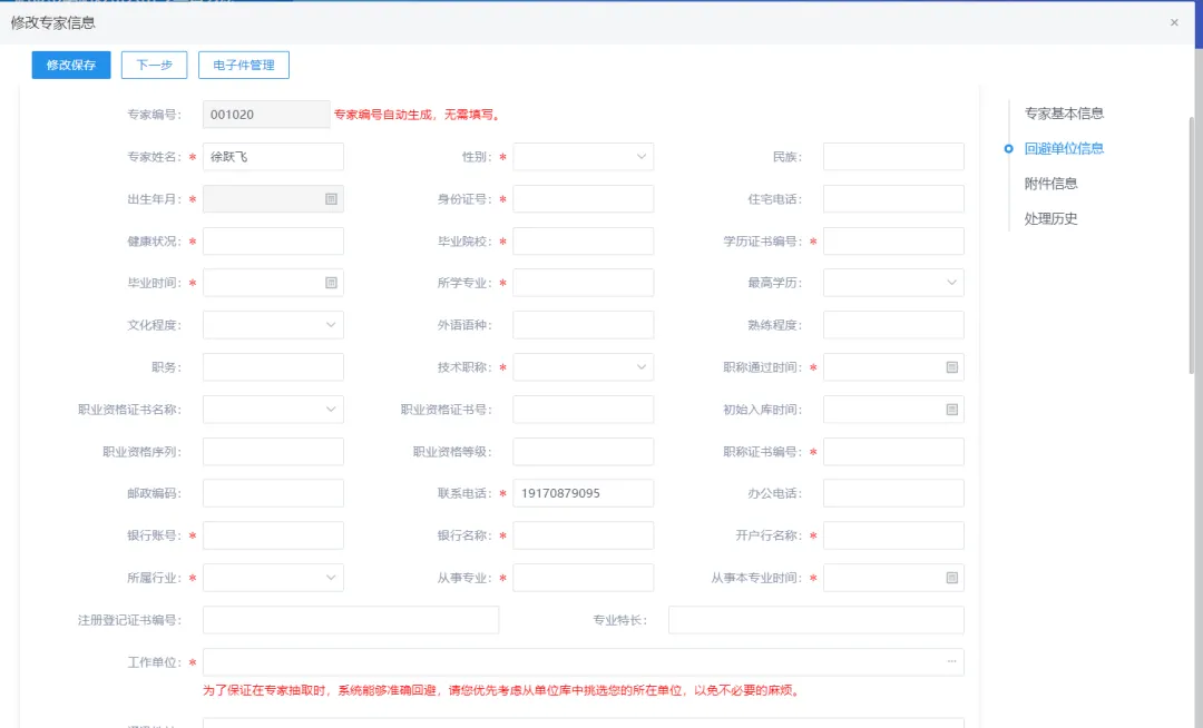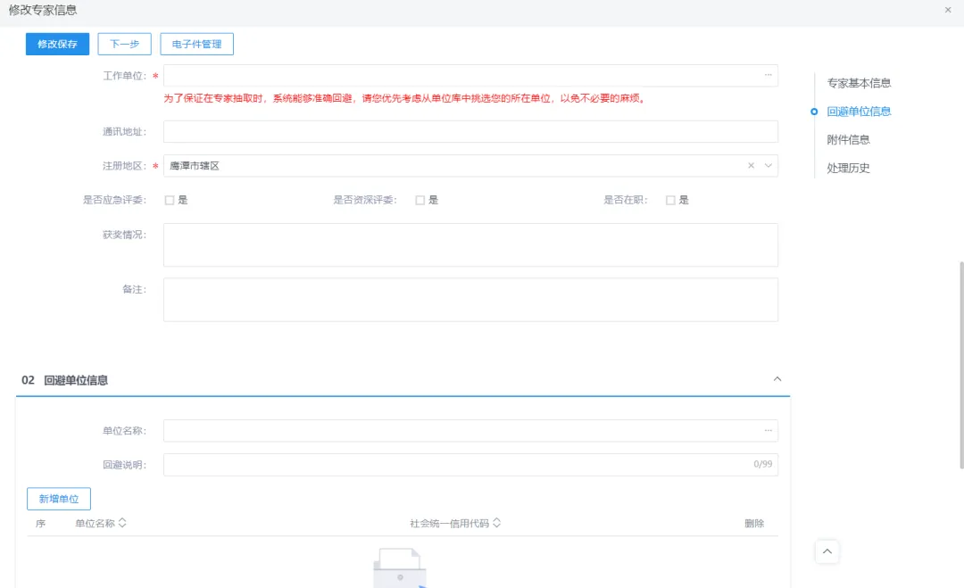 注:回避单位若不在单位信息库内,则无需填写。各专家填写好工作单位即可,系统会自动规避。