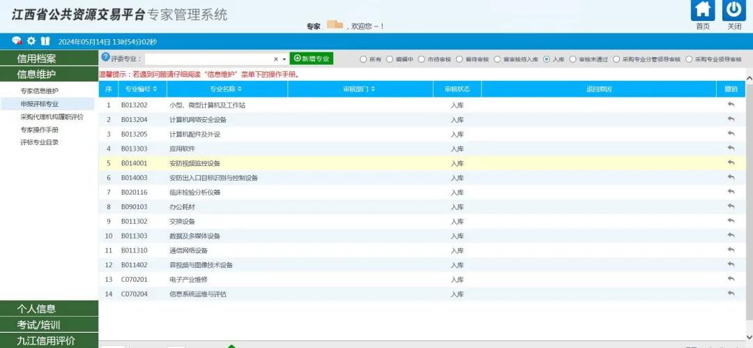 注:勾选的专业代码需与江西省公共资源网专家库内专业代码一致。
